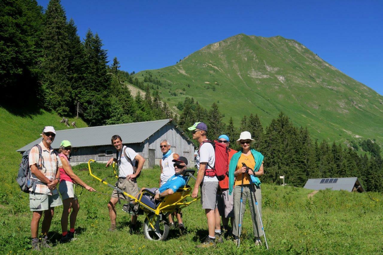 On est en droit d’imaginer le plaisir qu’ont pu éprouver les 4 personnes à mobilité réduite que nous avions hissées jusqu’à ce plateau au pied des Fiz, face au panorama de la chaine du Mont-Blanc. Et quelle ambiance, lorsque tout le monde fut installé pour le second plaisir, celui de partager un pique-nique, durant lequel chacun se proposait de faire goûter à tous sa spécialité, qui un cake aux olives, qui un moelleux au chocolat….